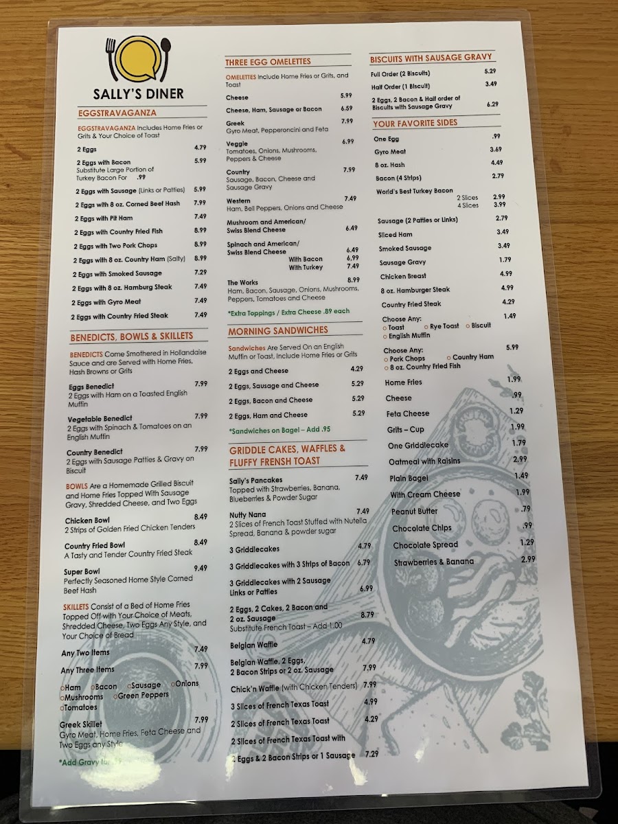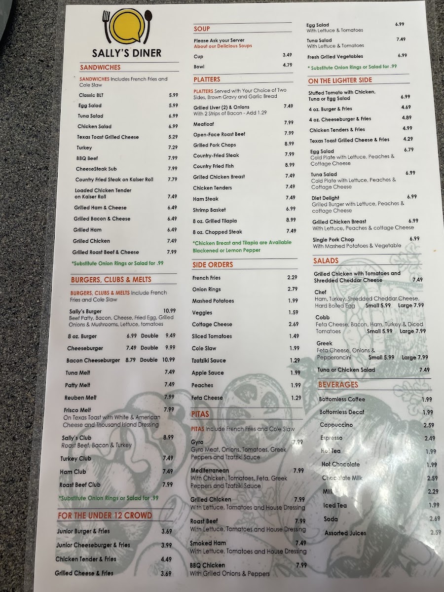 For lunch, indulge in mouthwatering classics such as the Sally's Burger, topped with bacon, cheese, and a fried egg or savor the Frisco Melt on Texas toast. The atmosphere is welcoming, enhanced by friendly staff who genuinely care about your experience.